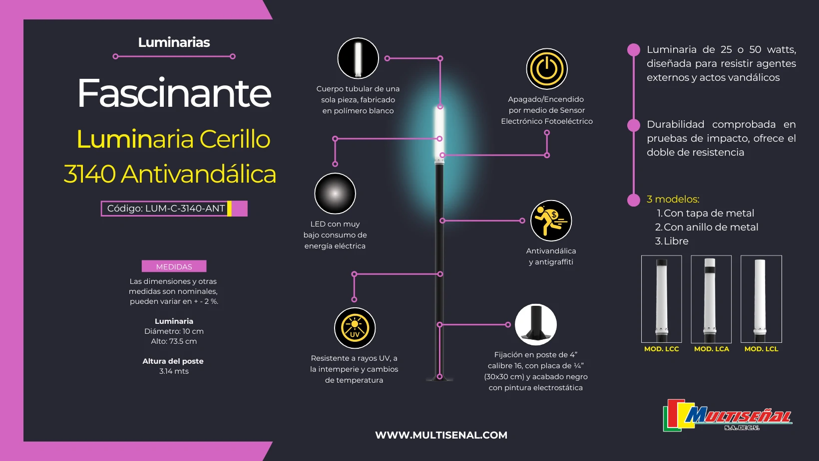 La Luminaria Cerillo Antivandálica revoluciona la iluminación vial al ofrecer una solución tecnológica avanzada, altamente resistente y respetuosa con el medio ambiente. Con opciones de 25 y 50 watts, combina un bajo consumo energético con un diseño robusto que se adapta a las necesidades de cualquier entorno urbano.