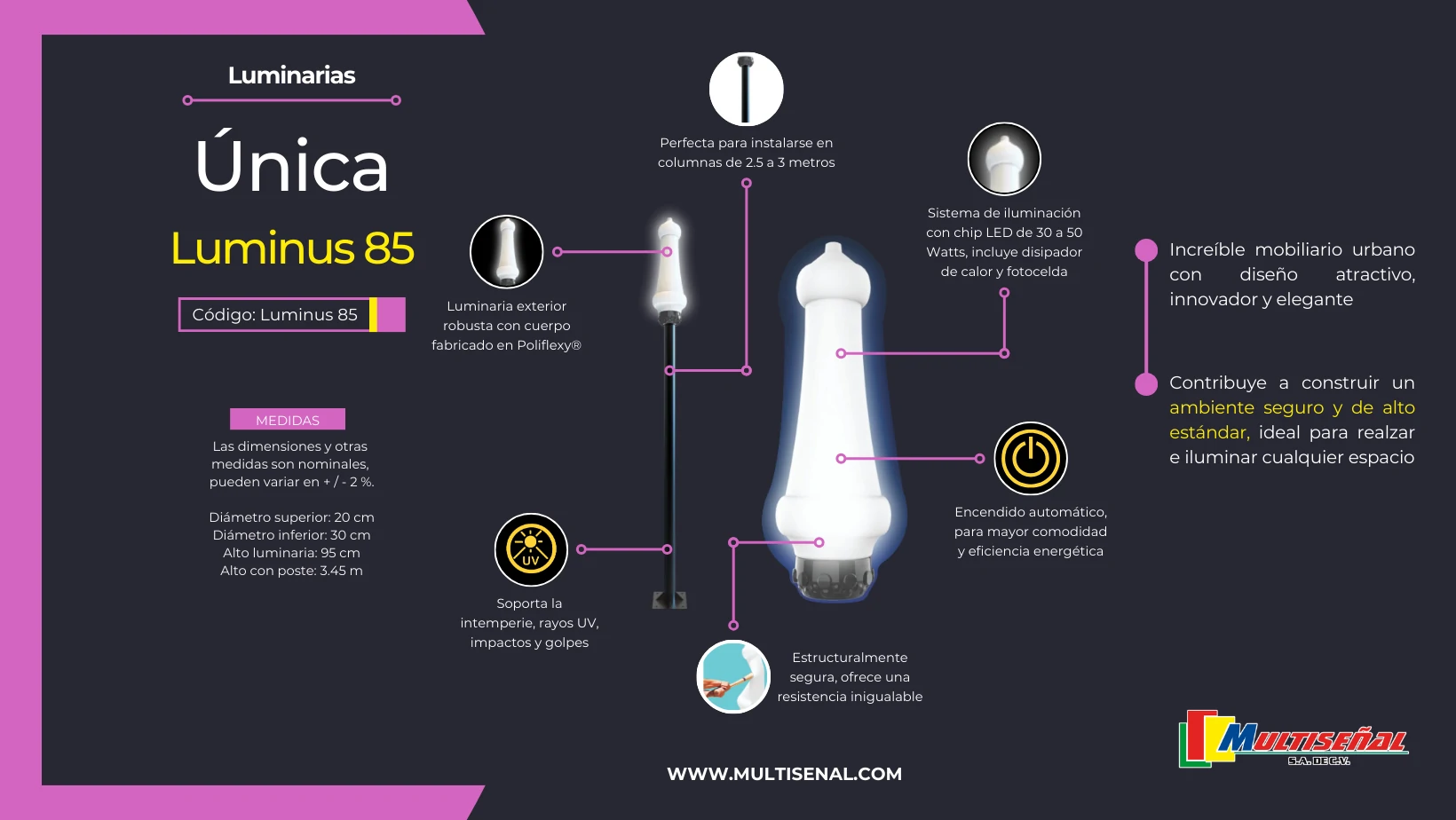 Descubre la luminus 85, una luminaria de mobiliario urbano con un diseño atractivo, innovador y elegante, creada con materiales de alta calidad que garantizan durabilidad y resistencia. Su instalación es sencilla, incluyendo todos los accesorios necesarios para un funcionamiento óptimo.