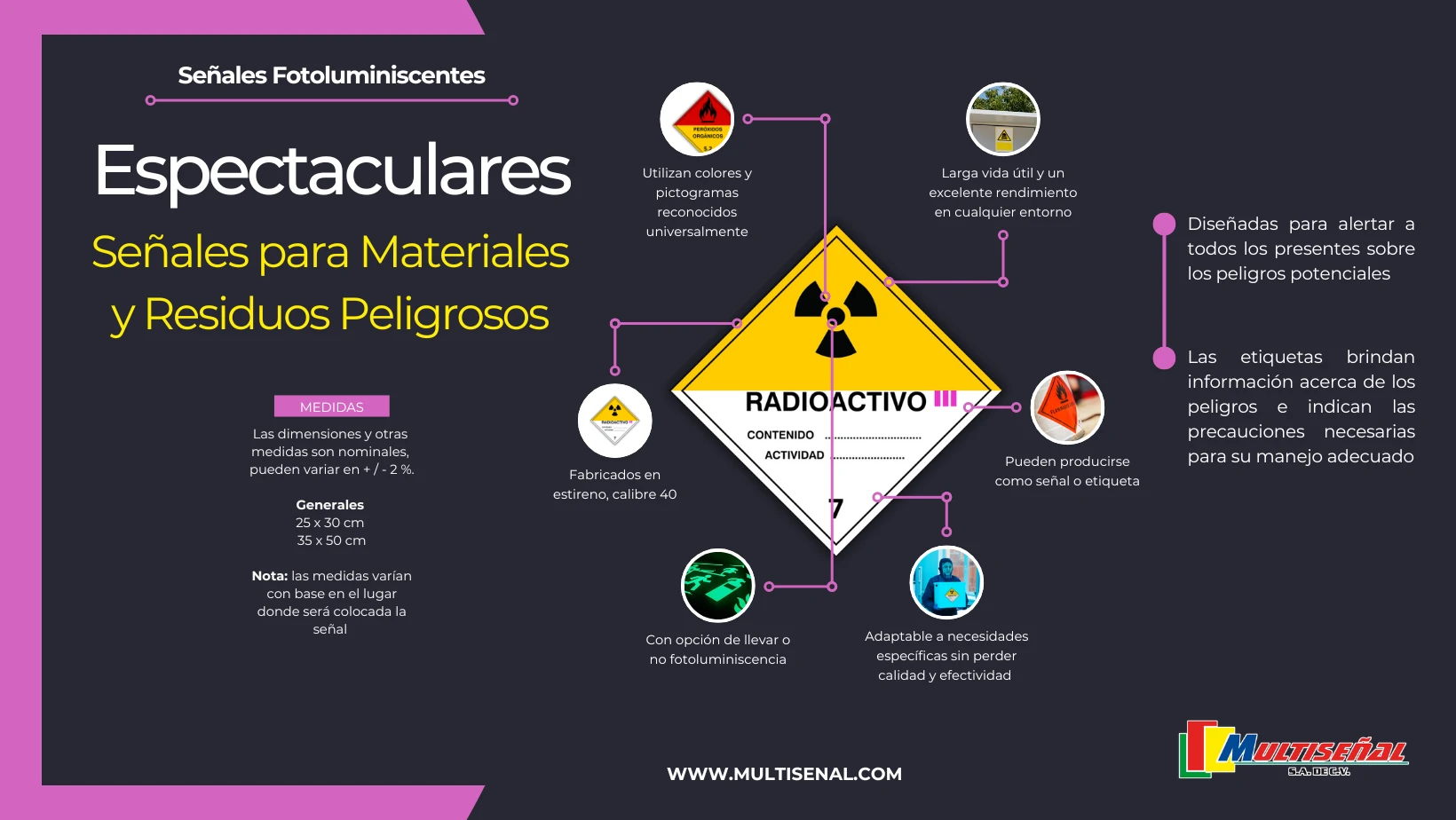 Incrementa la visibilidad y seguridad con señalamientos de material radiactivo que brillan en la oscuridad, garantizando una rápida detección en situaciones críticas.