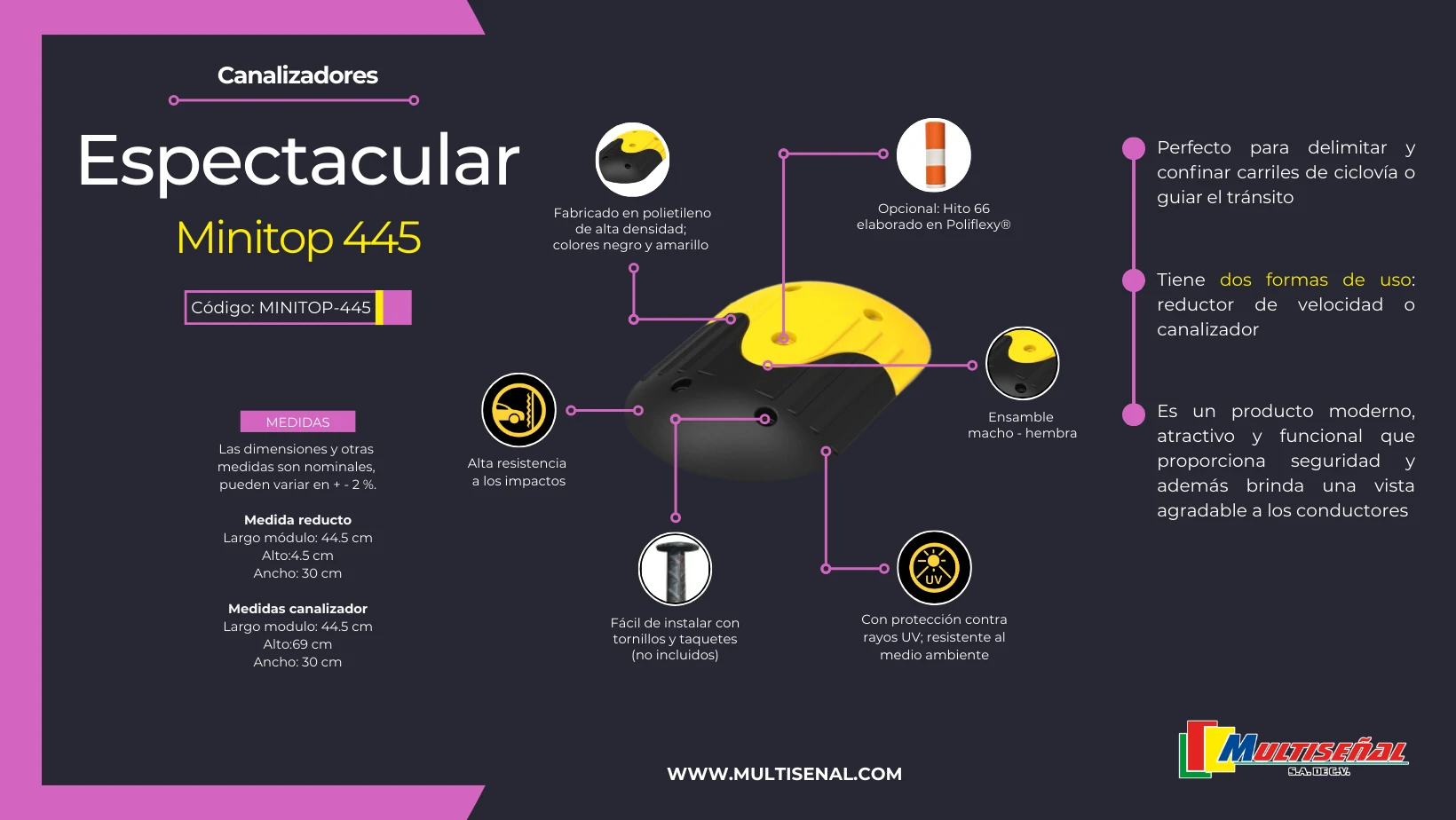 - Multifuncionalidad: El Minitop 445 no solo demarca carriles, sino que también actúa como reductor de velocidad o canalizador, brindando soluciones prácticas para diversas necesidades de tráfico.