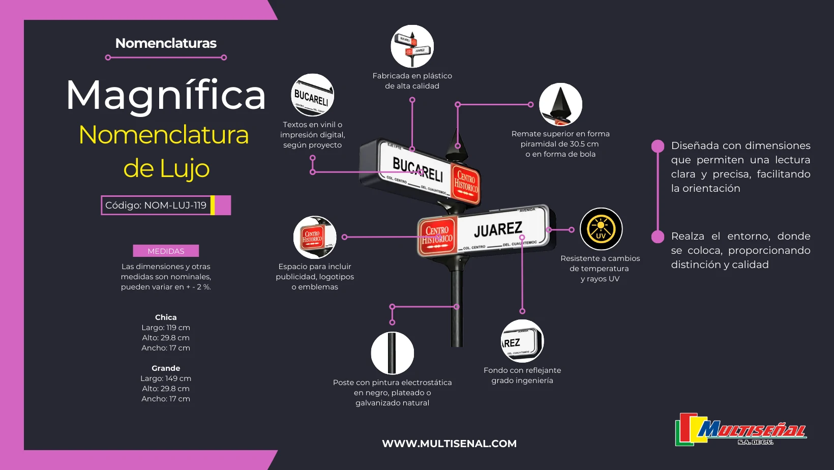 Ya sea en calles concurridas, plazas bulliciosas o diversos establecimientos, cada señal y placa se coloca estratégicamente para que la información sea de fácil lectura y orientación.