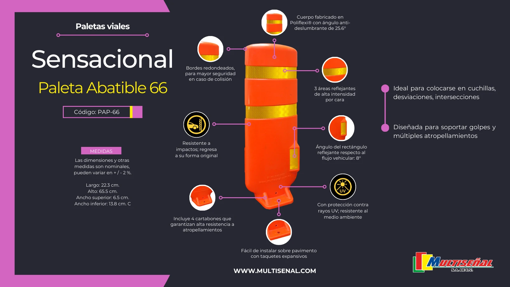 Presentamos la paleta abatible 66, una solución avanzada diseñada para optimizar la gestión del tráfico de manera eficiente y segura. Con un cuerpo fabricado en Poliflex®, esta paleta no solo es resistente a fuertes golpes, sino que también es amigable con el medio ambiente y cuenta con una protección superior contra los dañinos rayos UV.