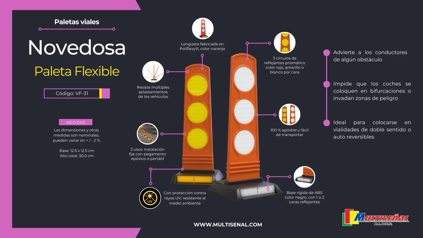 ¡Descubre nuestra innovadora paleta flexible, fabricada con nuestro exclusivo material registrado ViTem-Flex® y base de ABS! Este material altamente flexible y resistente garantiza durabilidad y versatilidad en diversas aplicaciones viales.