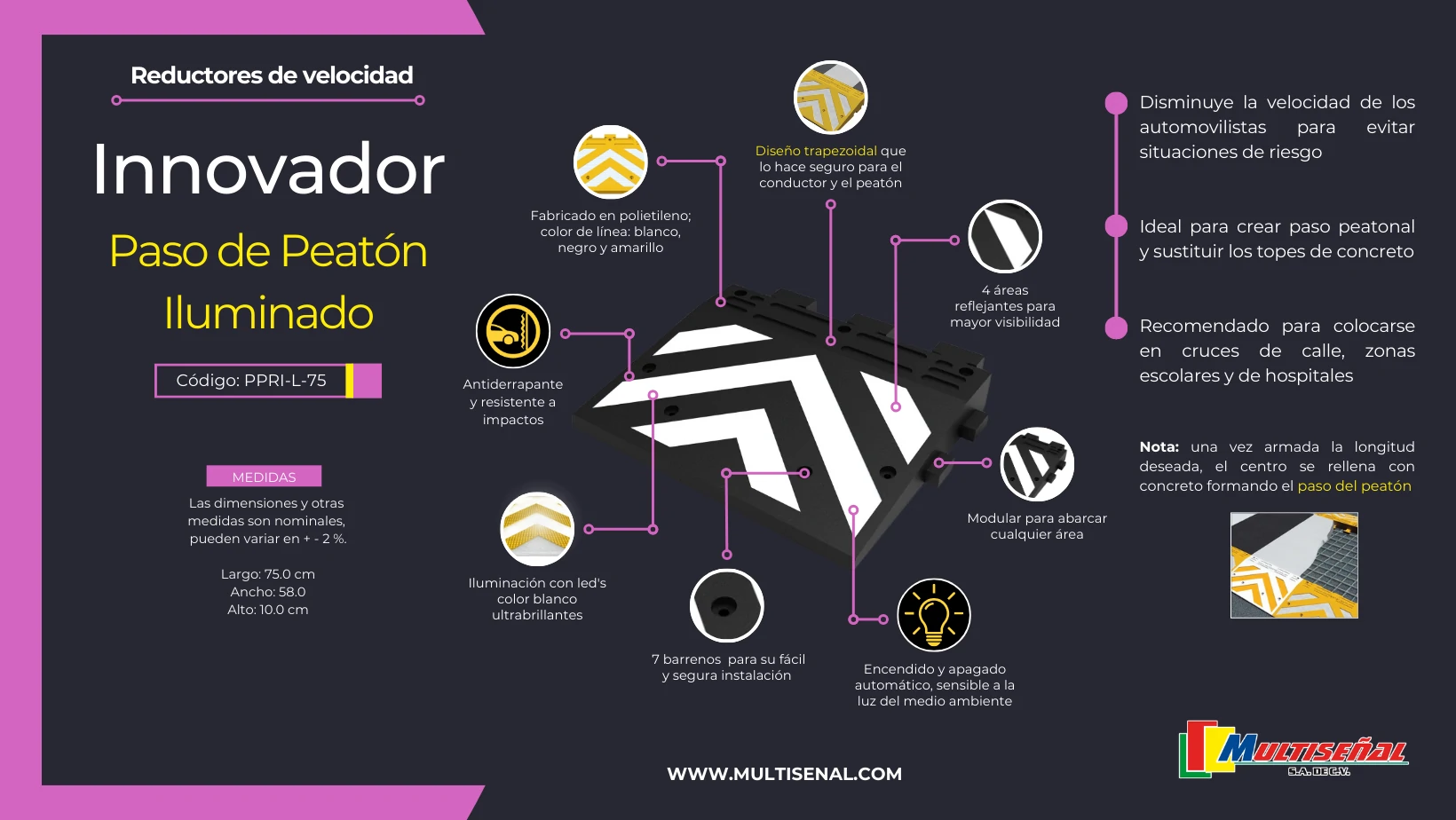 - Versatilidad de uso: Disponible en varias versiones adaptadas para diversos usos y aplicaciones, este paso de cebra es la elección ideal para cualquier avenida, mejorando la seguridad vial de peatones y conductores.