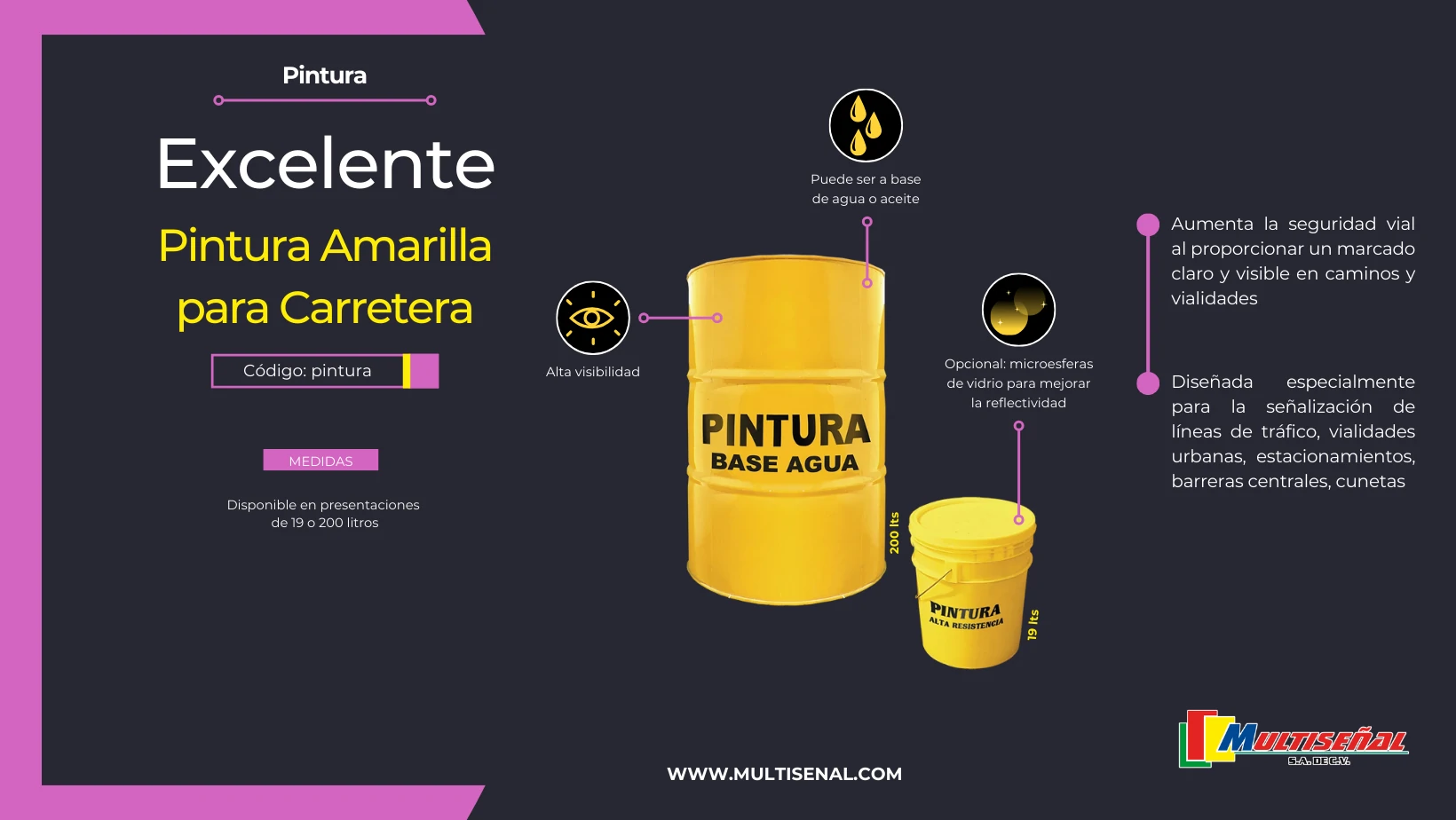 Ya sea que estés involucrado en proyectos viales a gran escala o necesites una solución confiable para espacios urbanos, la Pintura para Carreteras – Amarilla es la elección perfecta para una señalización eficiente y duradera.