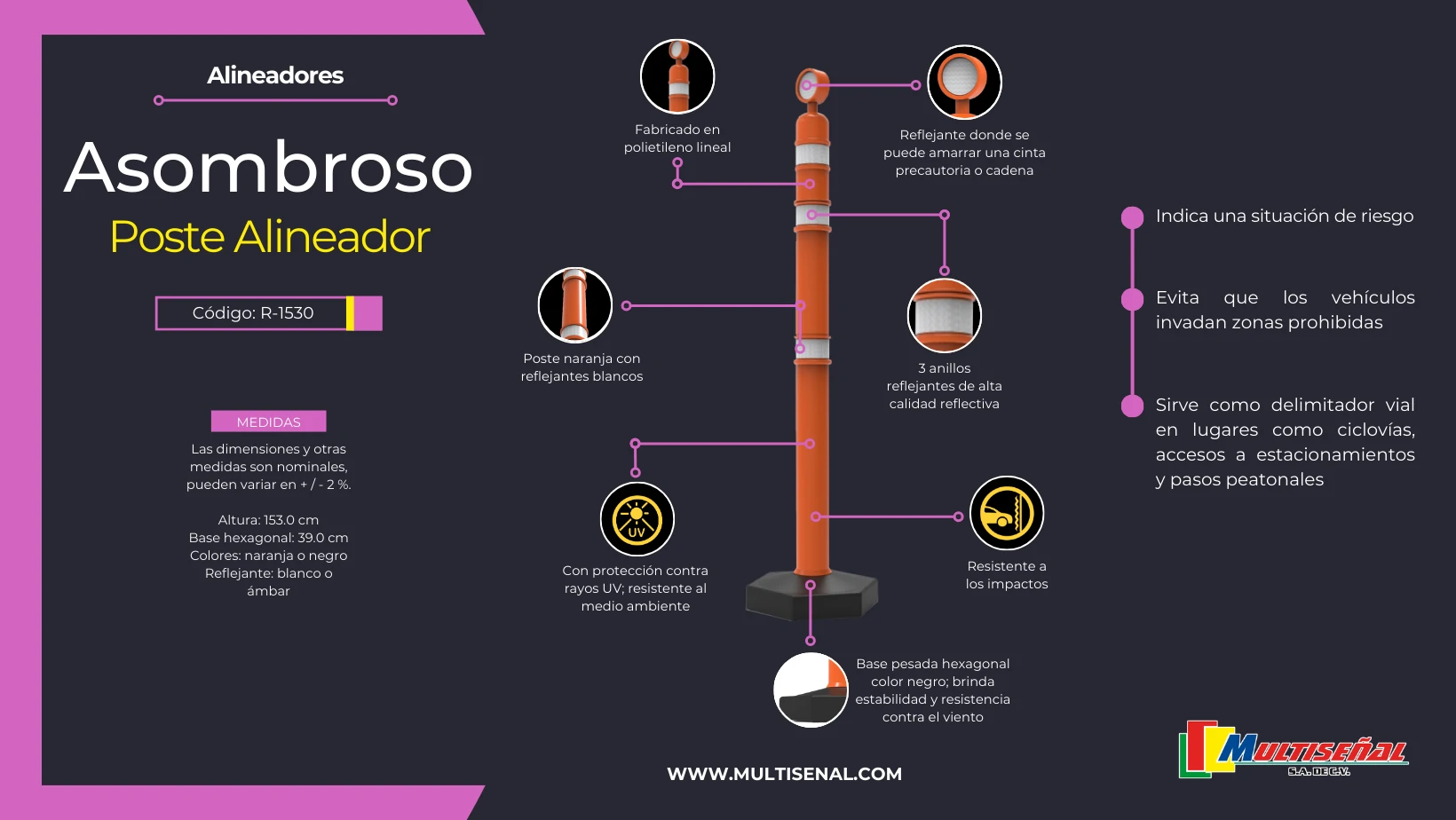 - Resistencia Inquebrantable: Fabricado en polietileno de media densidad, este poste demuestra una fortaleza excepcional frente a las inclemencias del tiempo y a cambios extremos de temperatura. Su protección contra rayos UV asegura una durabilidad prolongada, mientras que el color vibrante y las tres franjas de reflejante proporcionan una visibilidad sin igual.