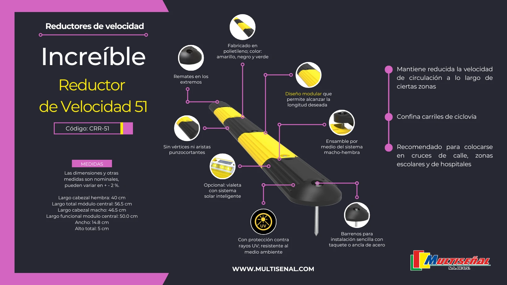 Con el reductor de velocidad 51, garantizamos una solución eficaz para el control del tráfico, priorizando la seguridad vial y ofreciendo versatilidad en su aplicación.