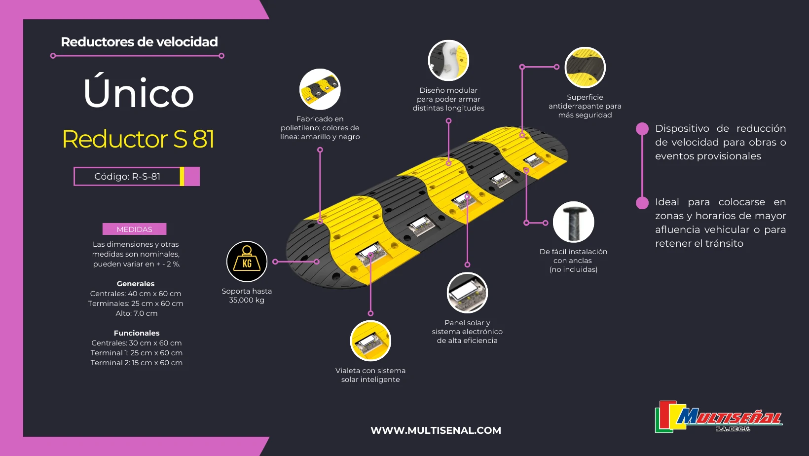 El Reductor S-81 es un dispositivo colocado sobre la superficie asfáltica, diseñado para mantener velocidades de circulación reducidas en tramos específicos de la vía.