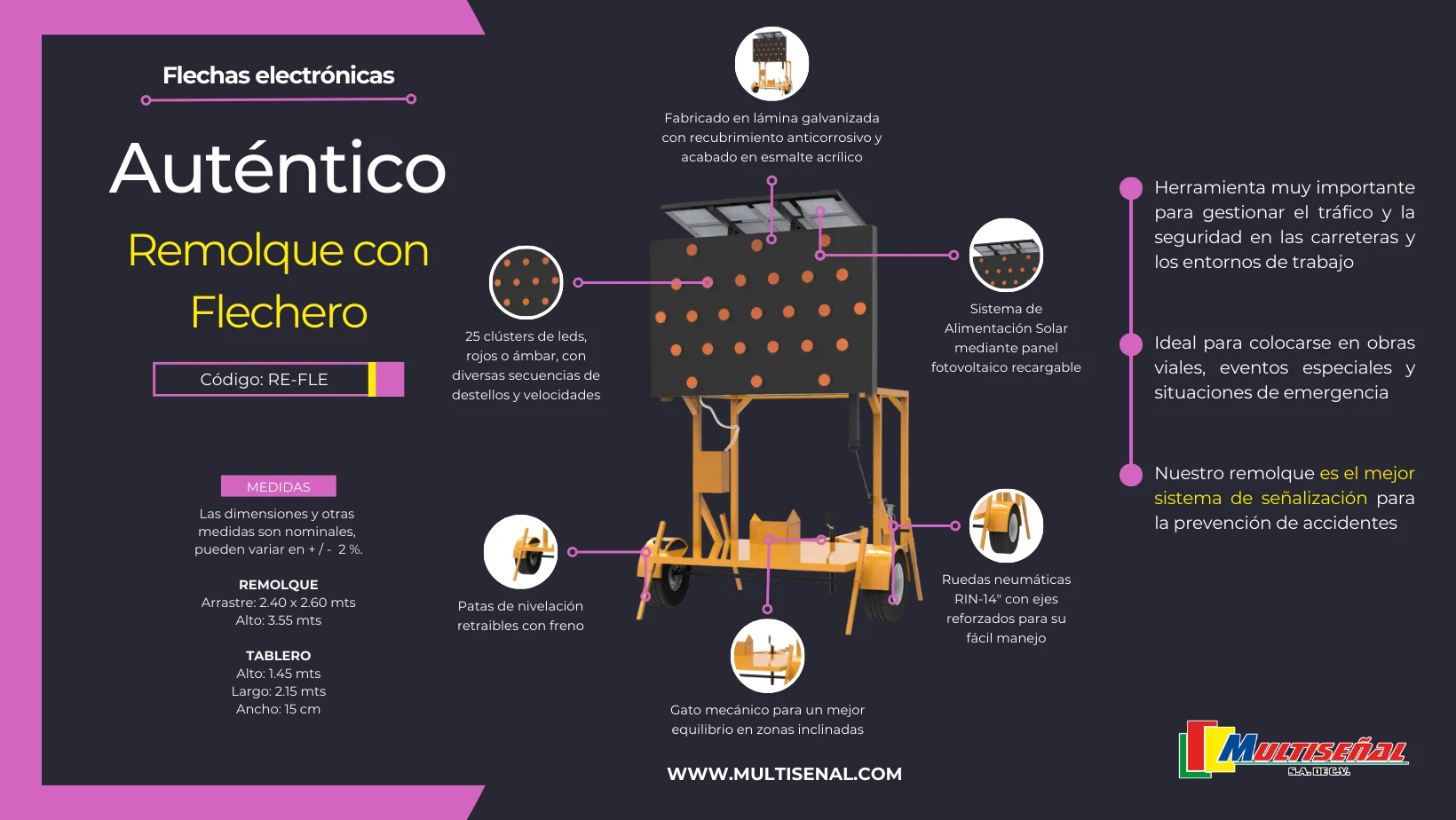 Descubre la máxima eficiencia en señalización vial con nuestro remolque con flechero, una solución luminosa y parpadeante que garantiza una visibilidad óptima en diversas situaciones.