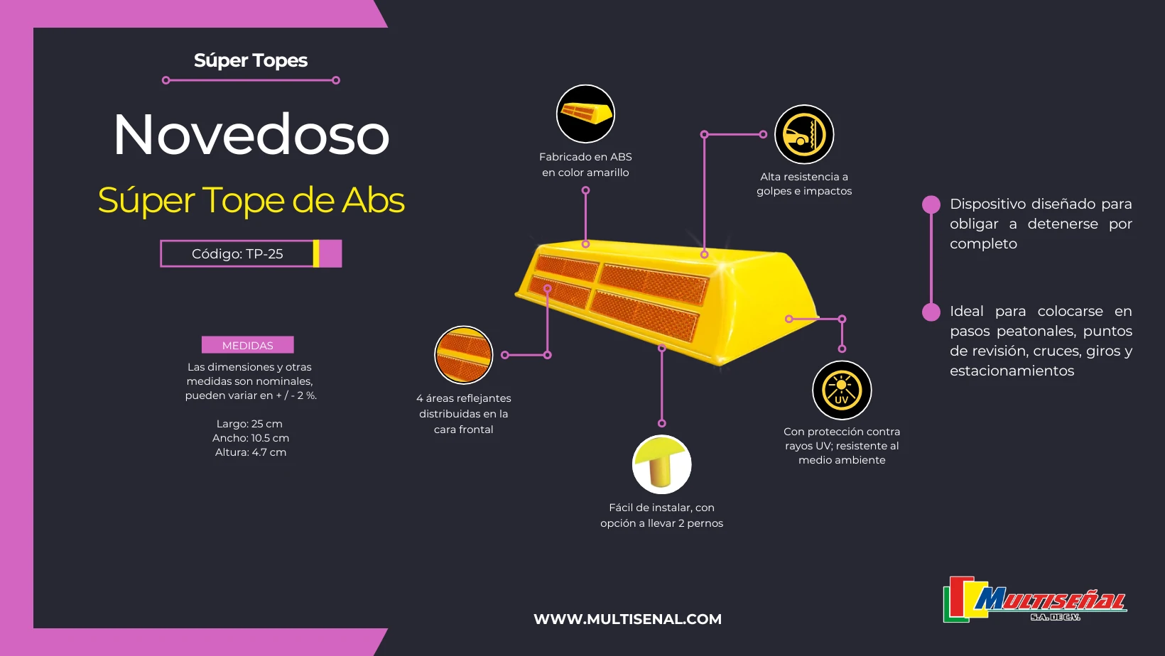 El Super Tope de ABS es una herramienta esencial para garantizar la seguridad vial y controlar el tráfico en áreas críticas. Su diseño y características lo convierten en una opción confiable para gestionar el flujo vehicular en sitios como entronques, cuchillas y zonas de obras, ofreciendo protección y eficacia en situaciones que demandan medidas de seguridad precisas.