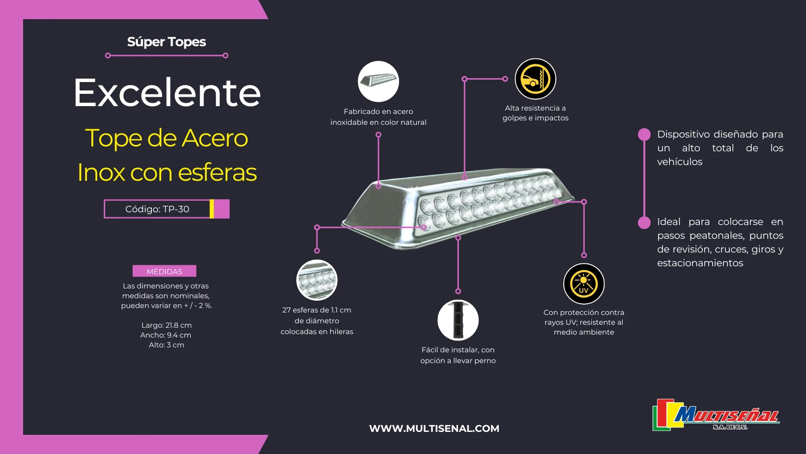 El Super Tope de Acero Inoxidable con Esferas es una solución confiable y robusta para el control de tráfico y la mejora de la seguridad en diversos espacios. Su diseño combina resistencia y funcionalidad, convirtiéndolo en una herramienta indispensable para gestionar el flujo vehicular y proteger áreas críticas.