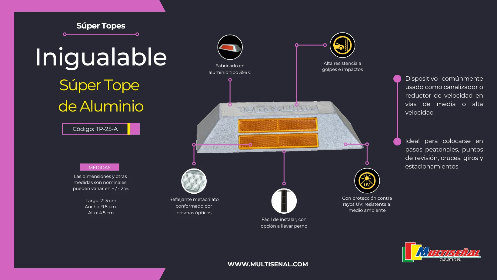 El Super Tope de Aluminio es una solución eficaz y confiable diseñada para mejorar la seguridad vial al actuar como canalizador y reductor de velocidad en carreteras con tráfico moderado a intenso. Su diseño y construcción lo convierten en una herramienta ideal para fomentar un tránsito más seguro tanto para conductores como para peatones, adaptándose a diversas necesidades y entornos.
