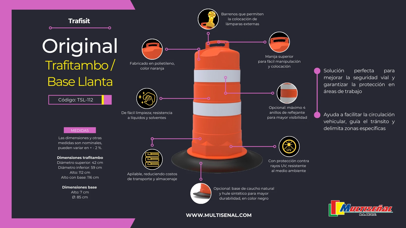 El trafitambo con base de llanta es una solución integral para la gestión del tráfico en diversas zonas. Cuenta con un diseño innovador y práctico gracias a su base de llanta, la cual, le brinda una mayor y mejor estabilidad. Ideal para colocarla en zonas con gran presencia de viento e, incluso, en climas adversos que presenten nieve. El trafitambo se mantendrá de pie a pesar de los obstáculos.