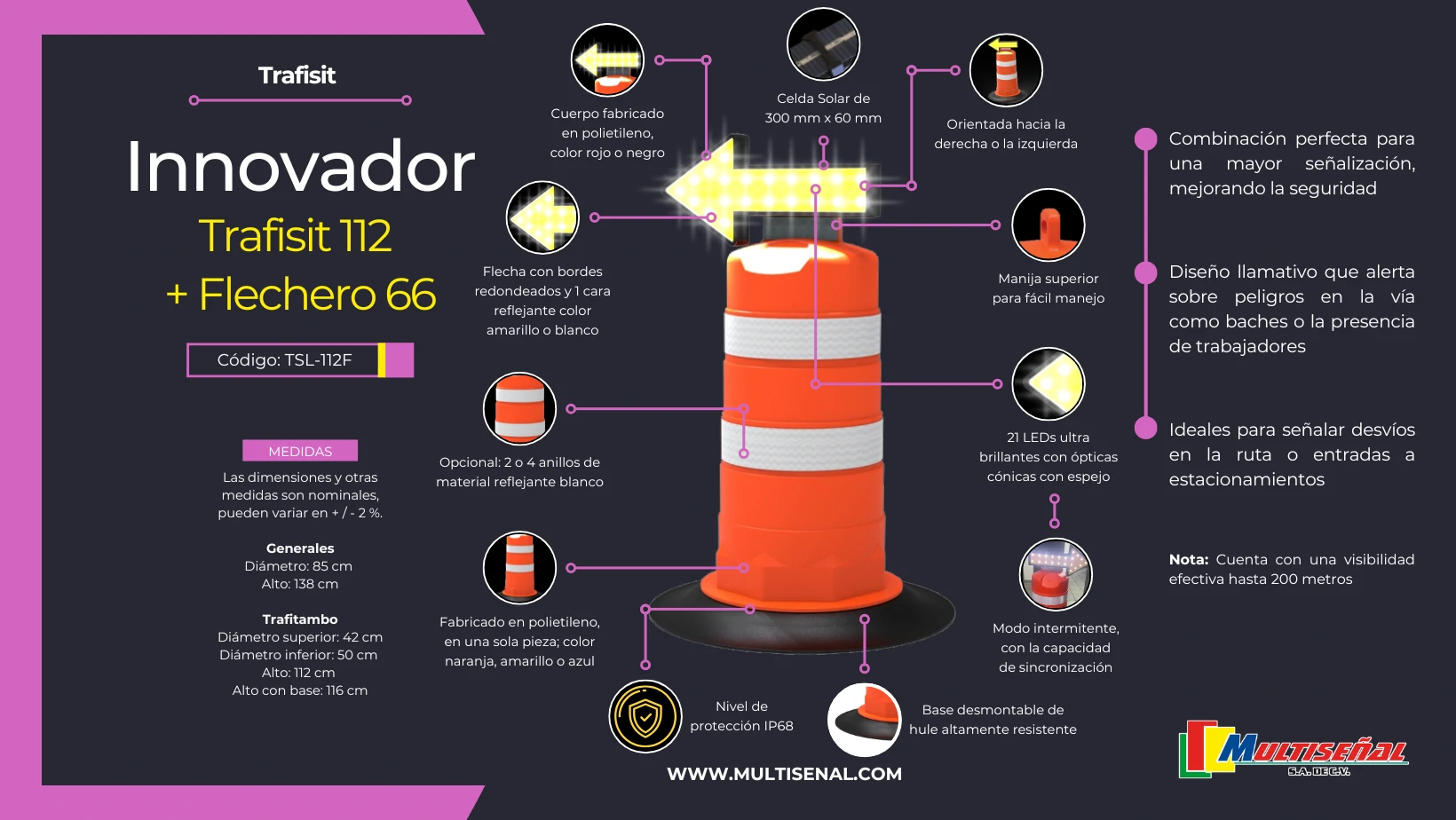 Conoce el Trafitambo con flecha solar, un innovador dispositivo de seguridad que redefine la gestión de la visibilidad en áreas de riesgo, como zonas de construcción y desvíos temporales.