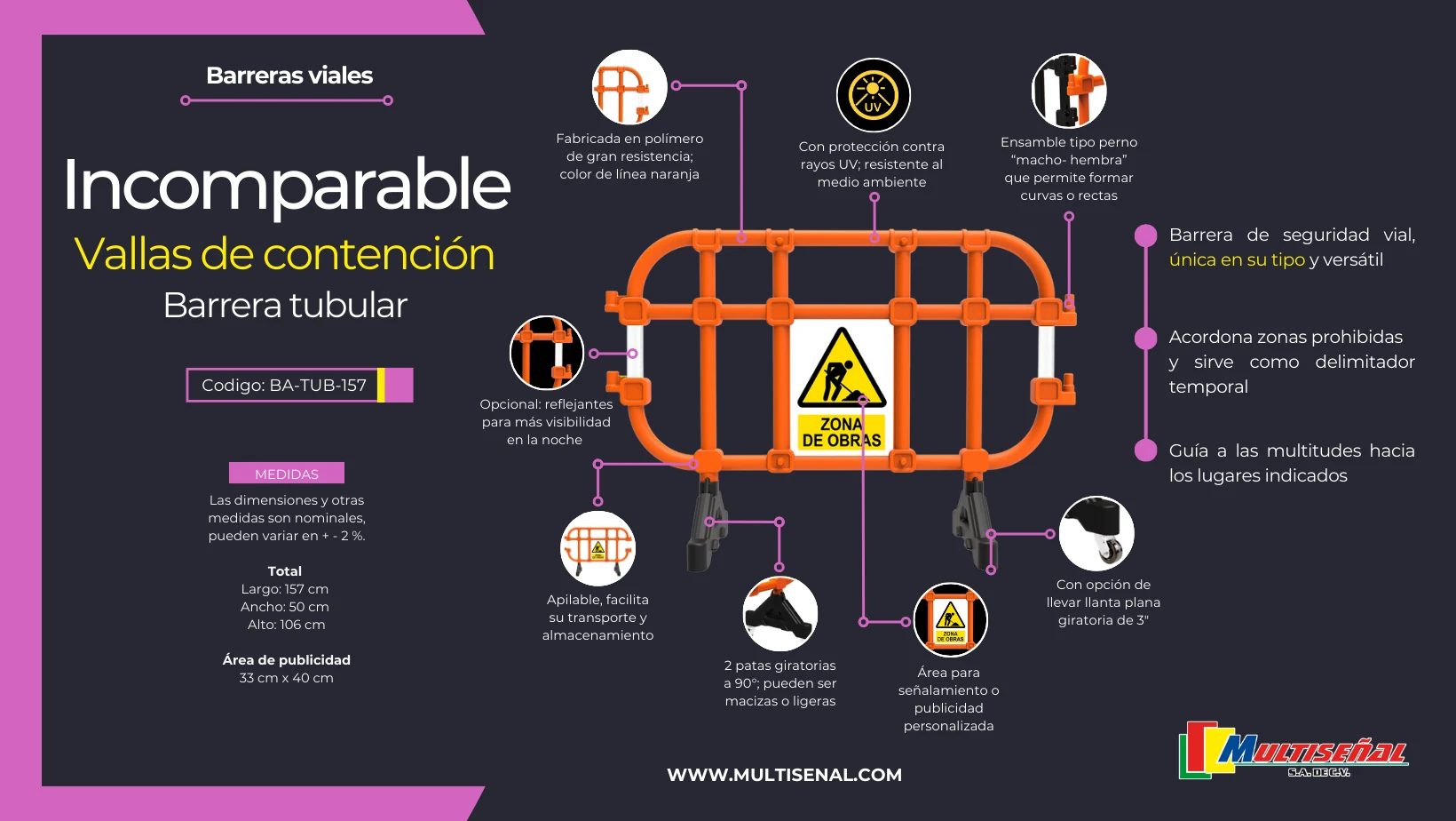 Con dos pies reforzados, estas vallas ofrecen una excelente estabilidad, y al ser giratorios, facilitan su transporte y almacenamiento.