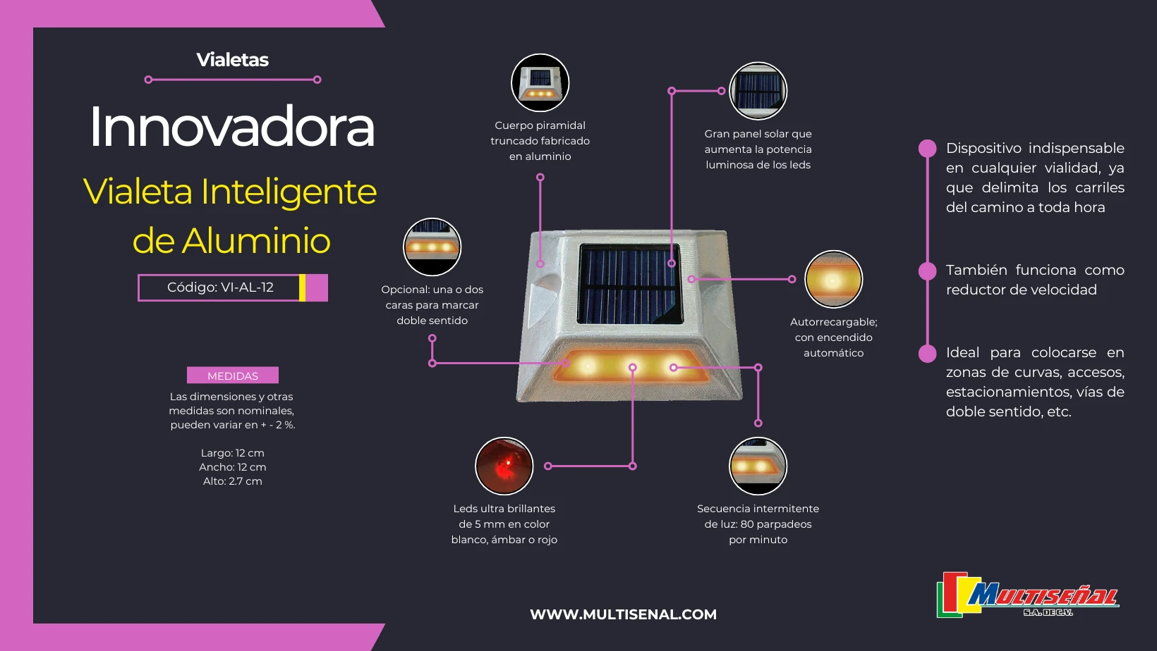 Fabricadas con materiales de alta calidad, estas vialetas ofrecen una visibilidad excepcional en diversas condiciones climáticas y períodos del día.