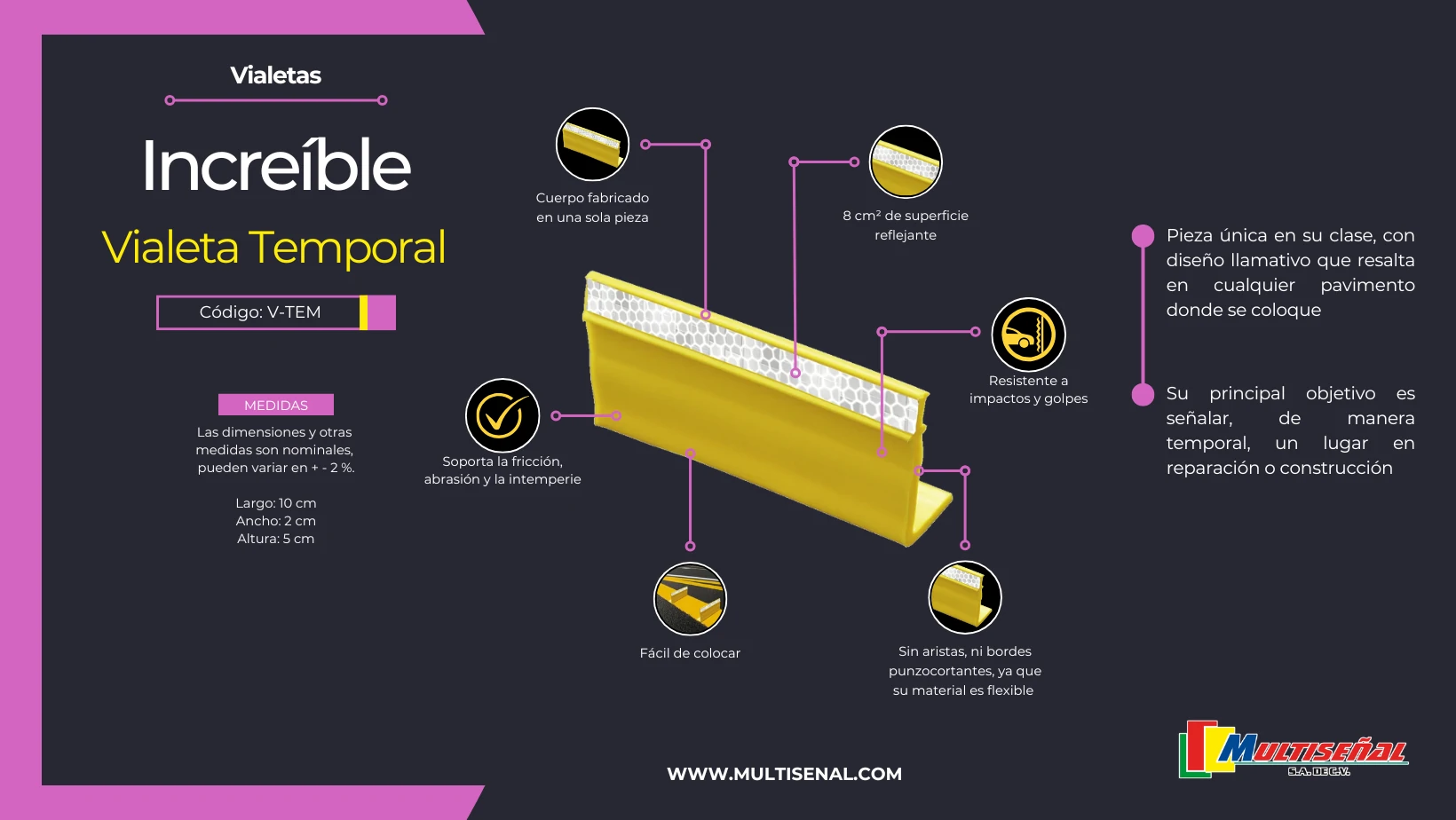La vialeta temporal diseñada con un estilo moderno, atractivo y vanguardista, se distingue en cualquier tipo de pavimento, siendo una opción ideal para señalizar reparaciones o trabajos de construcción de manera temporal.