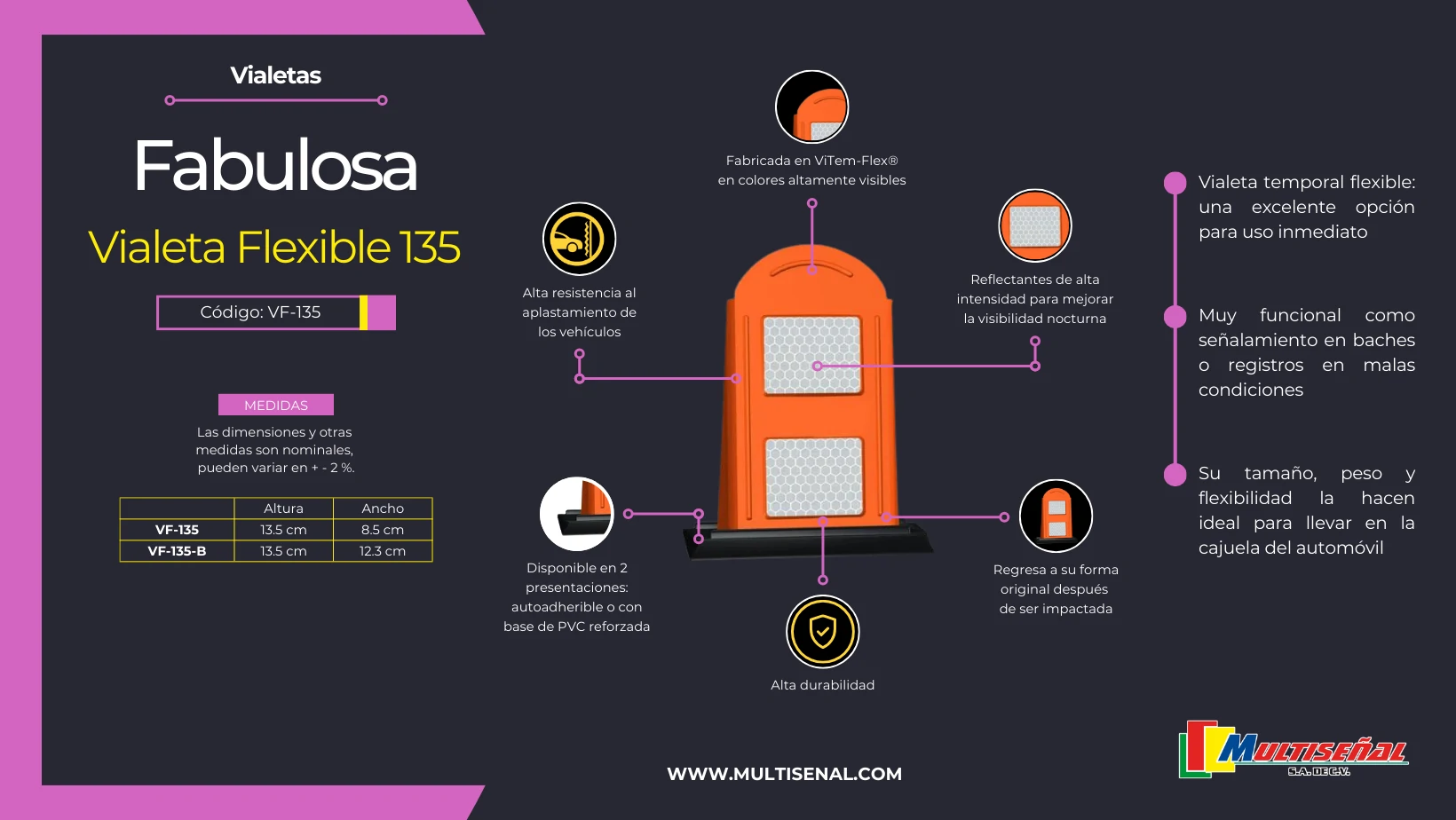 - Ideal para señalización temporal en baches o desagües abiertos, la vialeta se presenta como una opción eficaz y versátil.