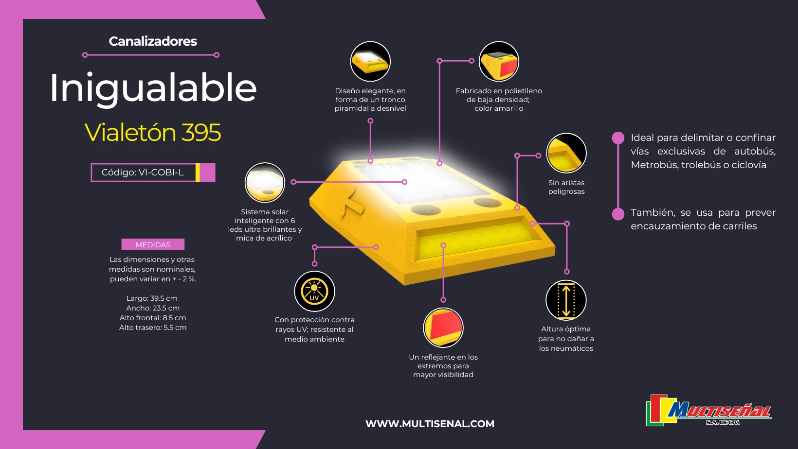 En resumen, el vialetón 395 es la opción innovadora y eficiente para la señalización vial, destacando por su diseño seguro, fácil instalación y sistema de iluminación solar inteligente.